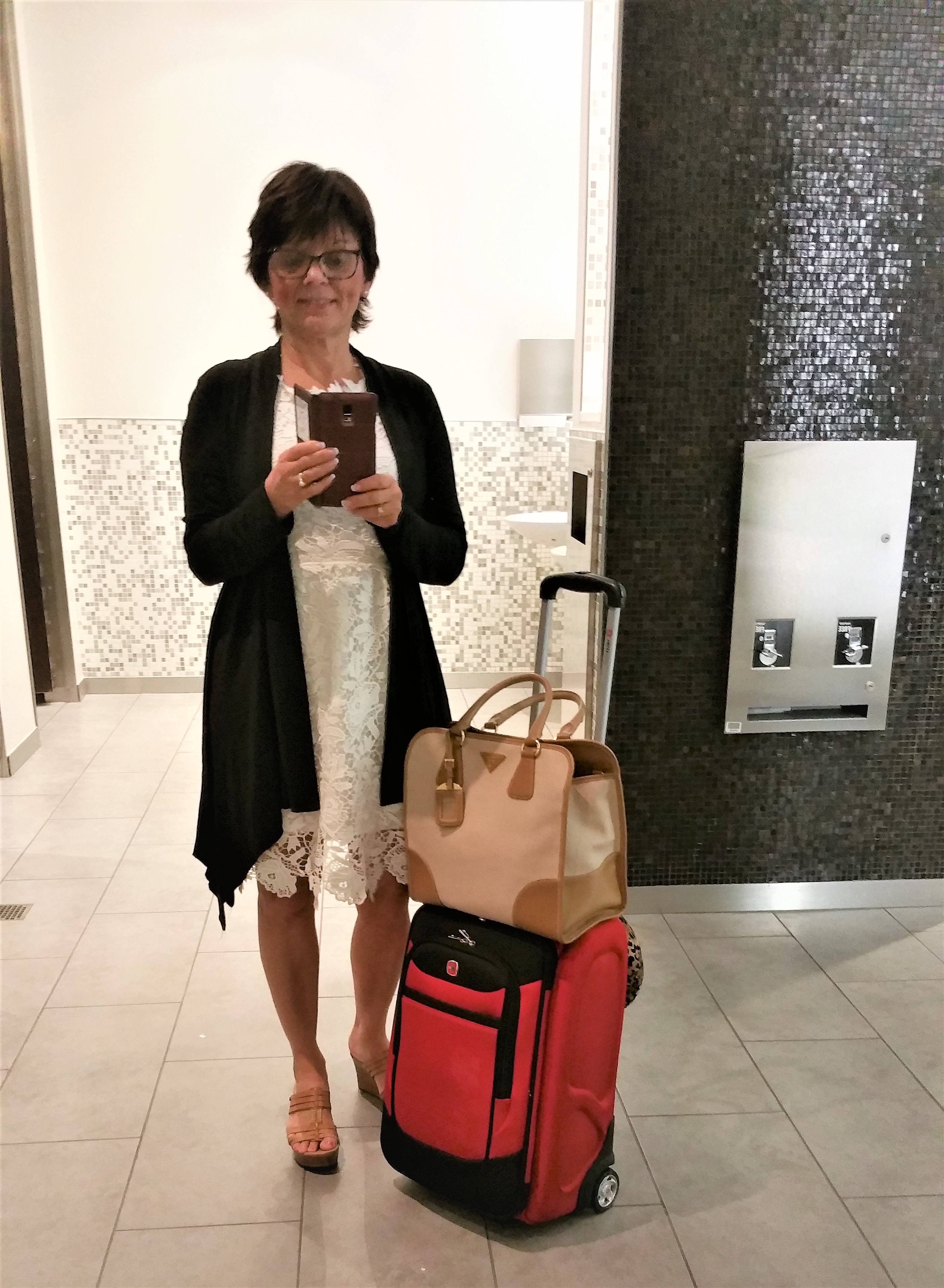 For the long 8 hour flight, I also forgo any shapewear, opting instead for the extreme comfort of a cotton (granny) panty.  But when I am walking to, or from the plane, my trusted wrap hides all of that.