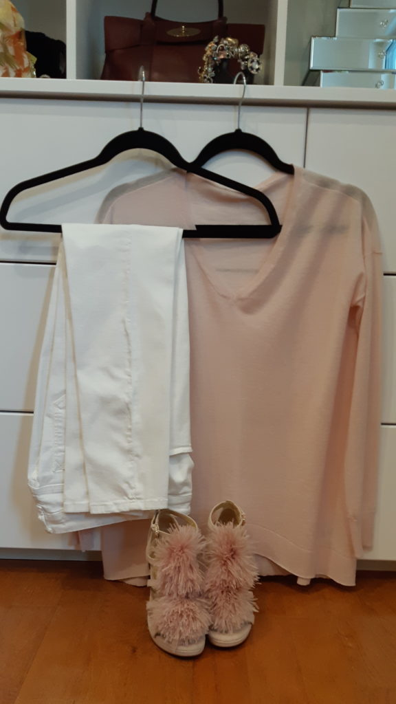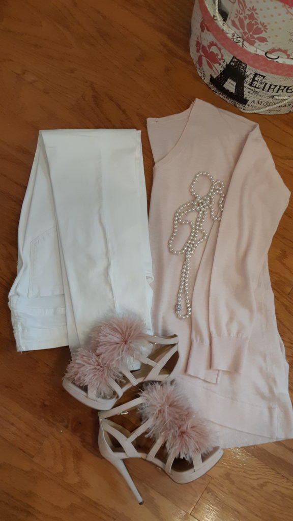 Next is skinny white jeans, with this oh so soft cashmere slouchy sweater. Paired with a strand of pearls and a blush colored clutch, this would make for a great outfit for a ‘Damas lunch’.