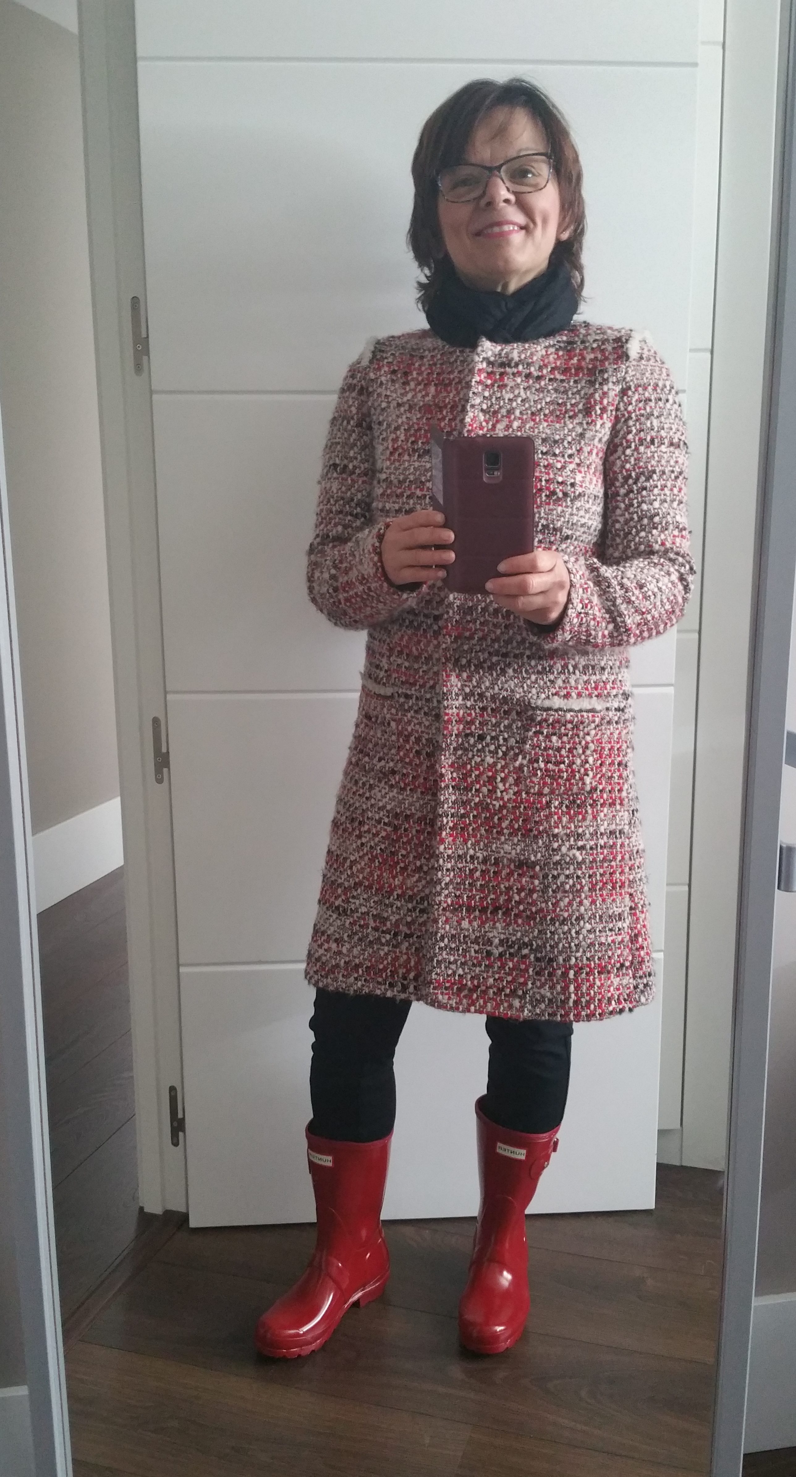 I dug out my brown Hunter rain boots that I brought with me from Canada, and tried them.  But they just did not do my wardrobe justice.